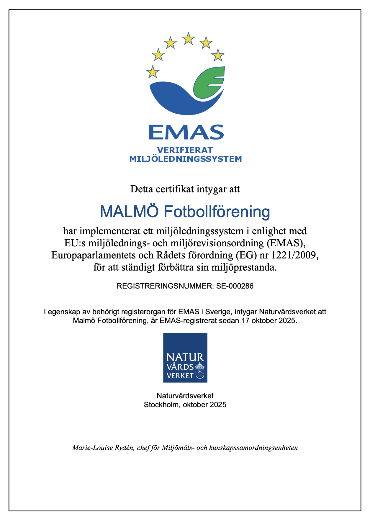 Våren 2023 påbörjades ett ambitiöst EU-finansierat projekt för att bryta ny mark för fotbollsklubbars miljö- och klimatarbete. Projektledning och akademiska expertkunskaper kom från professor Tiberio Daddi och hans team på Sant’Anna Scuola Superiore i Pisa, Italien. Malmö FF arbetade i projektet tillsammans med FC Porto, Betis Sevilla, det rumänska fotbollsförbundet, UEFA, EFC och Sport Positive, för att systematisera våra organisationers miljö- och klimatarbete. Målsättningen var att uppnå certifieringar, och på vägen uppdaterades policys, utbildades alla medarbetare och ett gediget internt analysarbete resulterade bl a i en livscykelanalys för en fullsatt Eleda stadion. I november 2025 gick projektet i mål och fyra medverkande organisationer har nu nått målen med certifieringar, och har satt en ny standard för hållbarhetsarbetet i sport.
