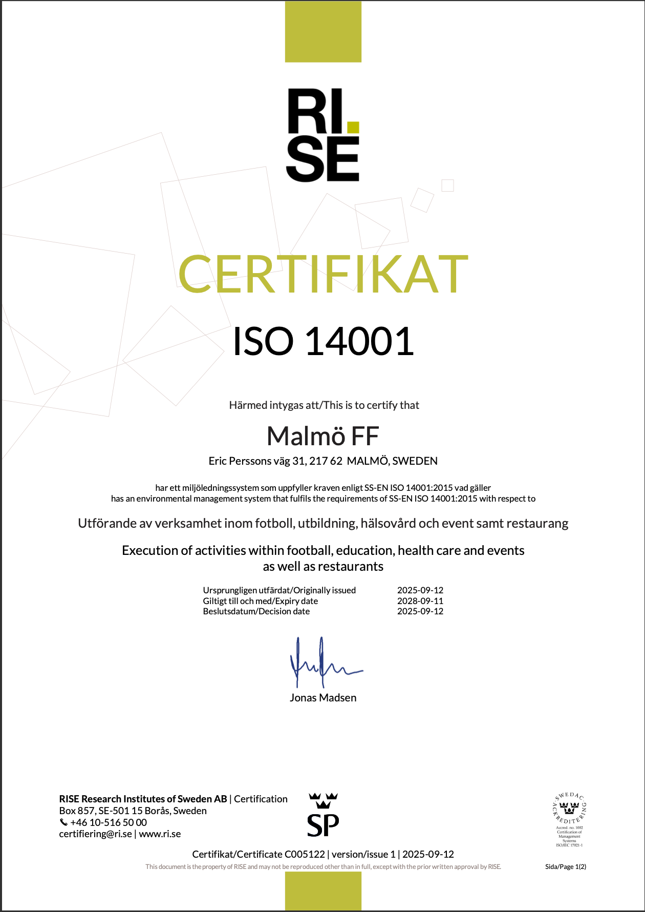Under 2024 arbetade Malmö FF med att stärka det systematiska arbetet för styrning av vårt hållbarhetsarbete, med syftet att som ISO 26000 föreskriver, vara en ”god samhällsmedborgare”. Alla kan ladda ner de numera 42 frågorna i Egendeklarationen för att få en idé om hur ens organisation ligger till i arbetet, men vi gick ett steg längre och blev under våren 2025 granskade av en extern av Swedac ackrediterad revisor från Verify Agency.