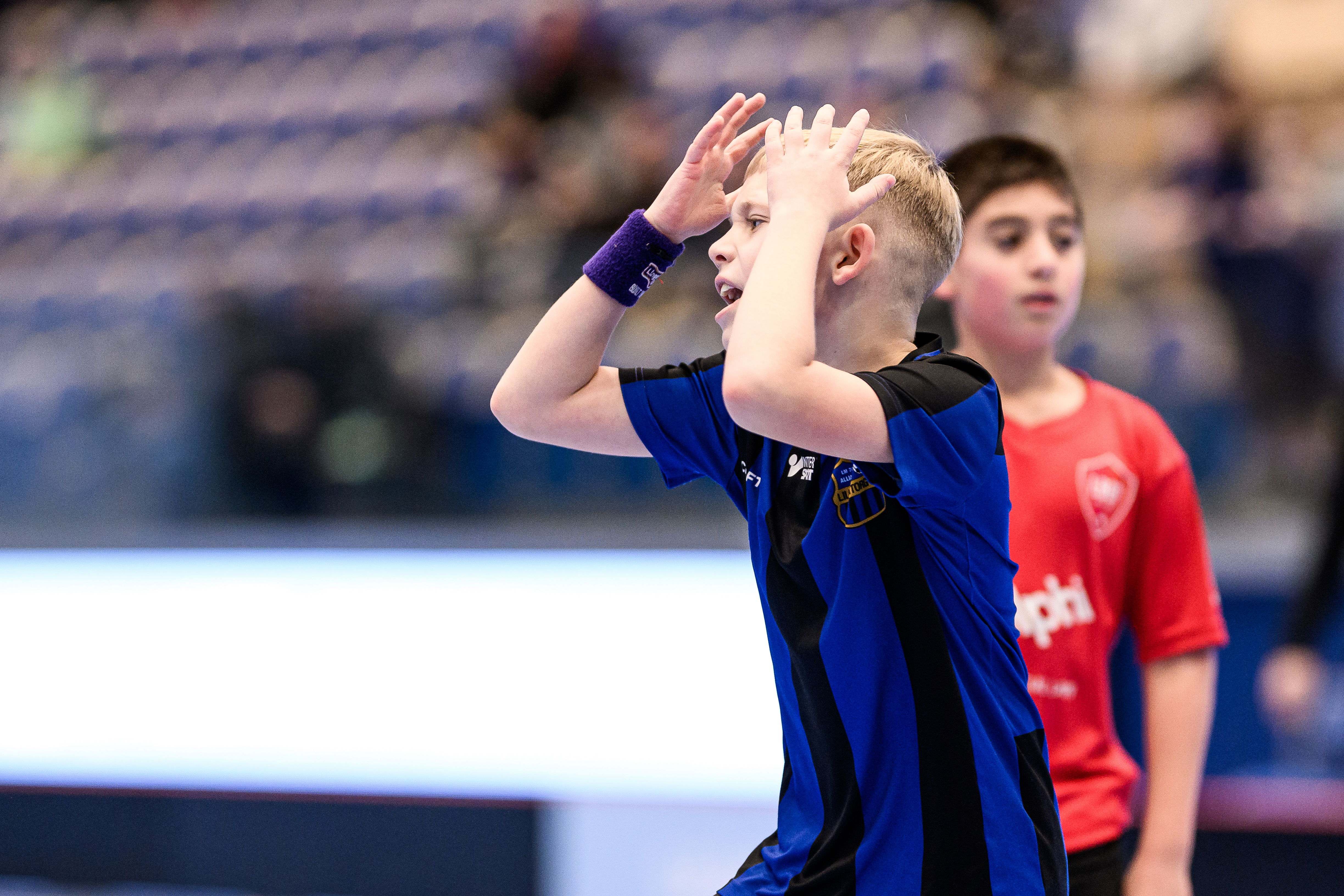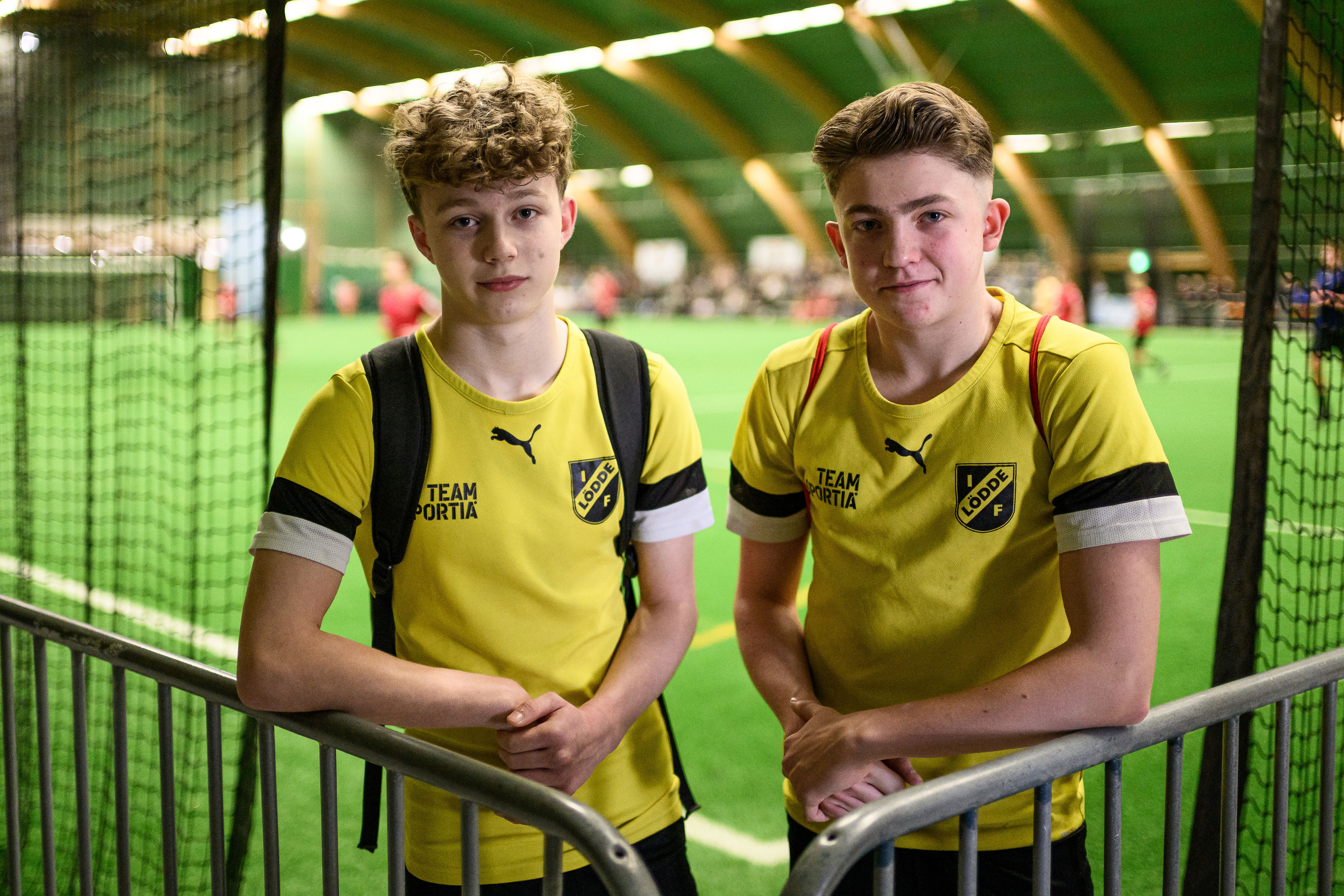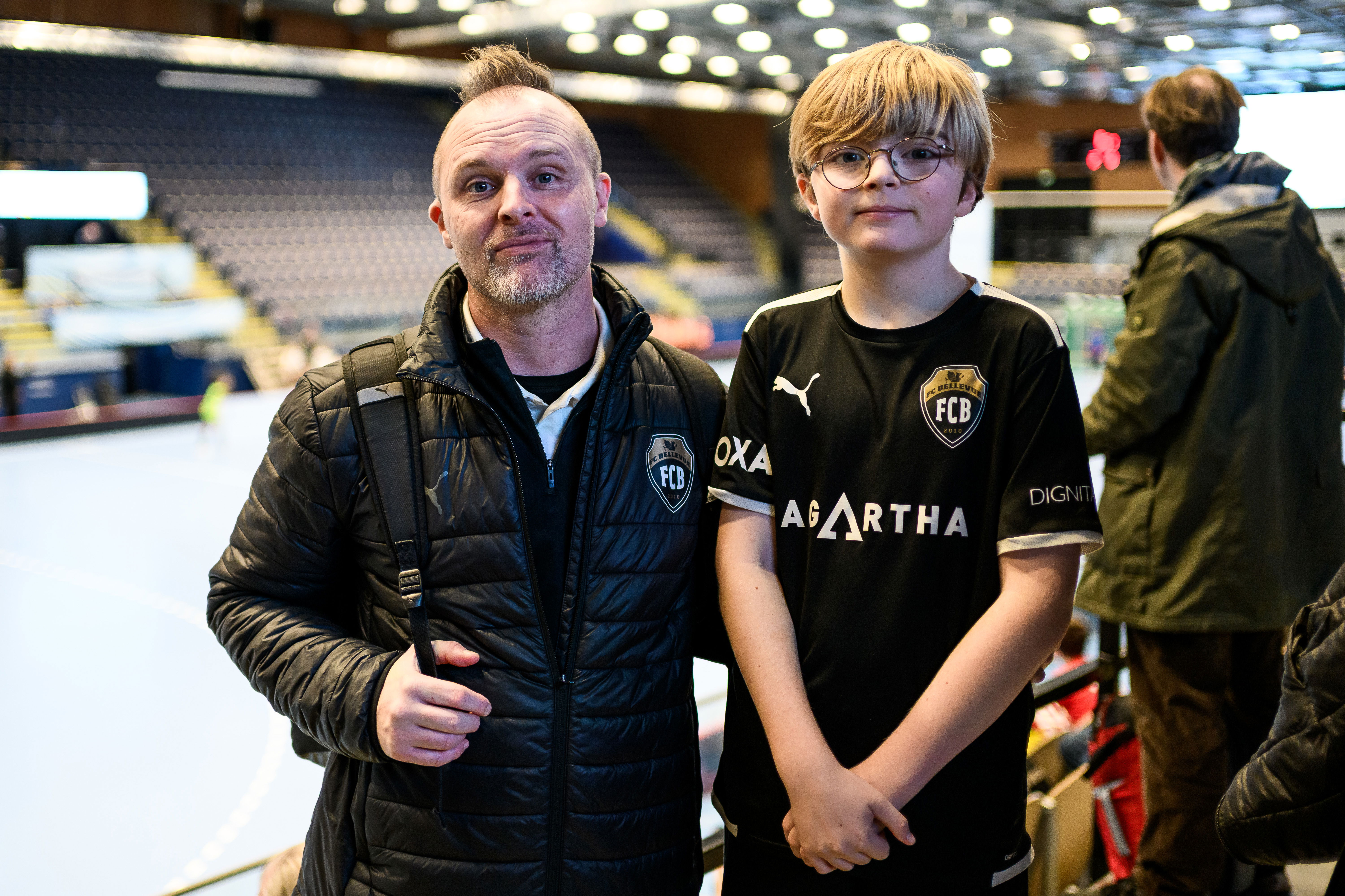 På andra sidan Eric Perssons väg, inne i Baltiska Hallen, spelar yngre barn. I dag är det P10 som gäller. Sam Söllgård Sonesson spelar i FC Bellevue och hans pappa Mark Sonesson tränar en av klubbens lag.