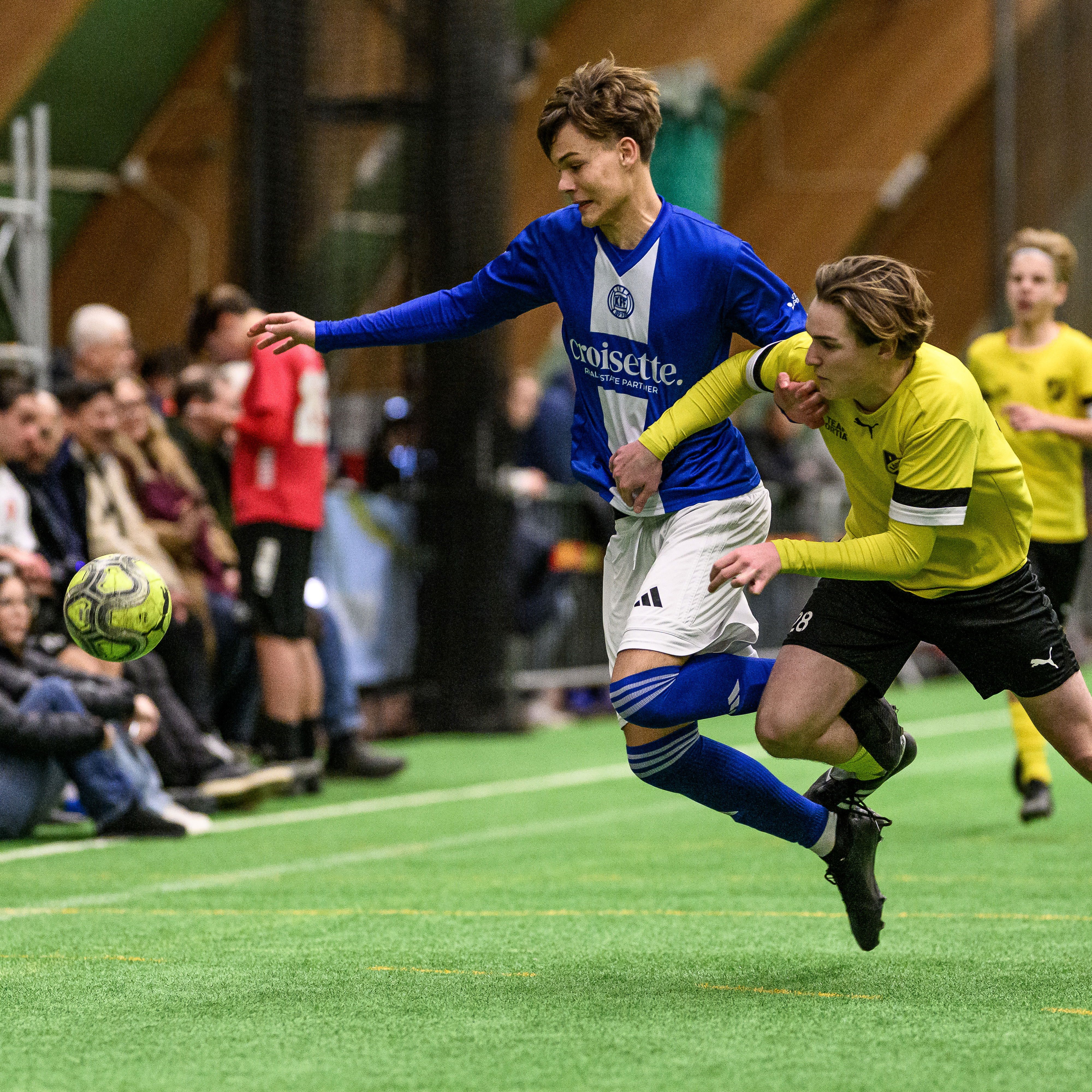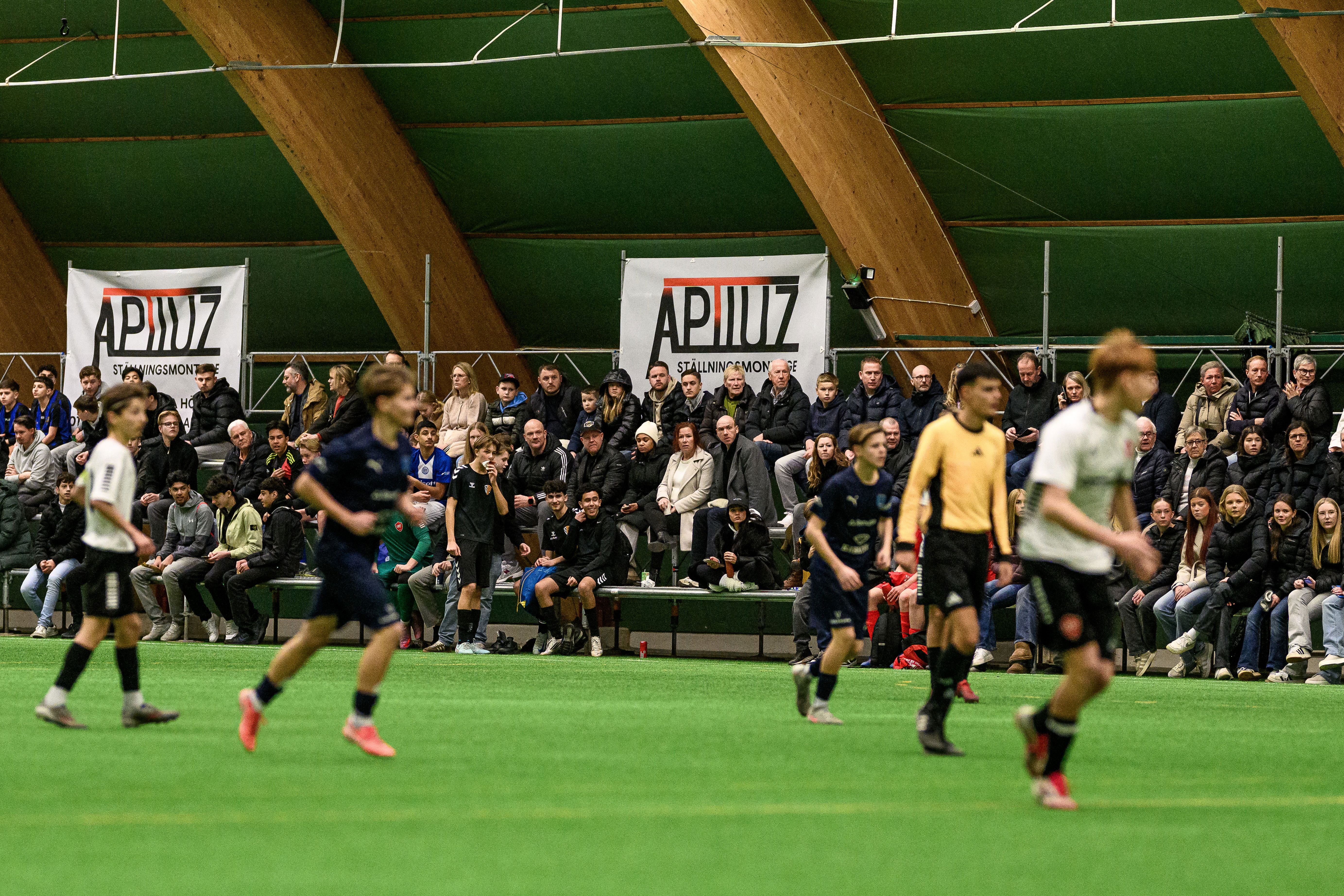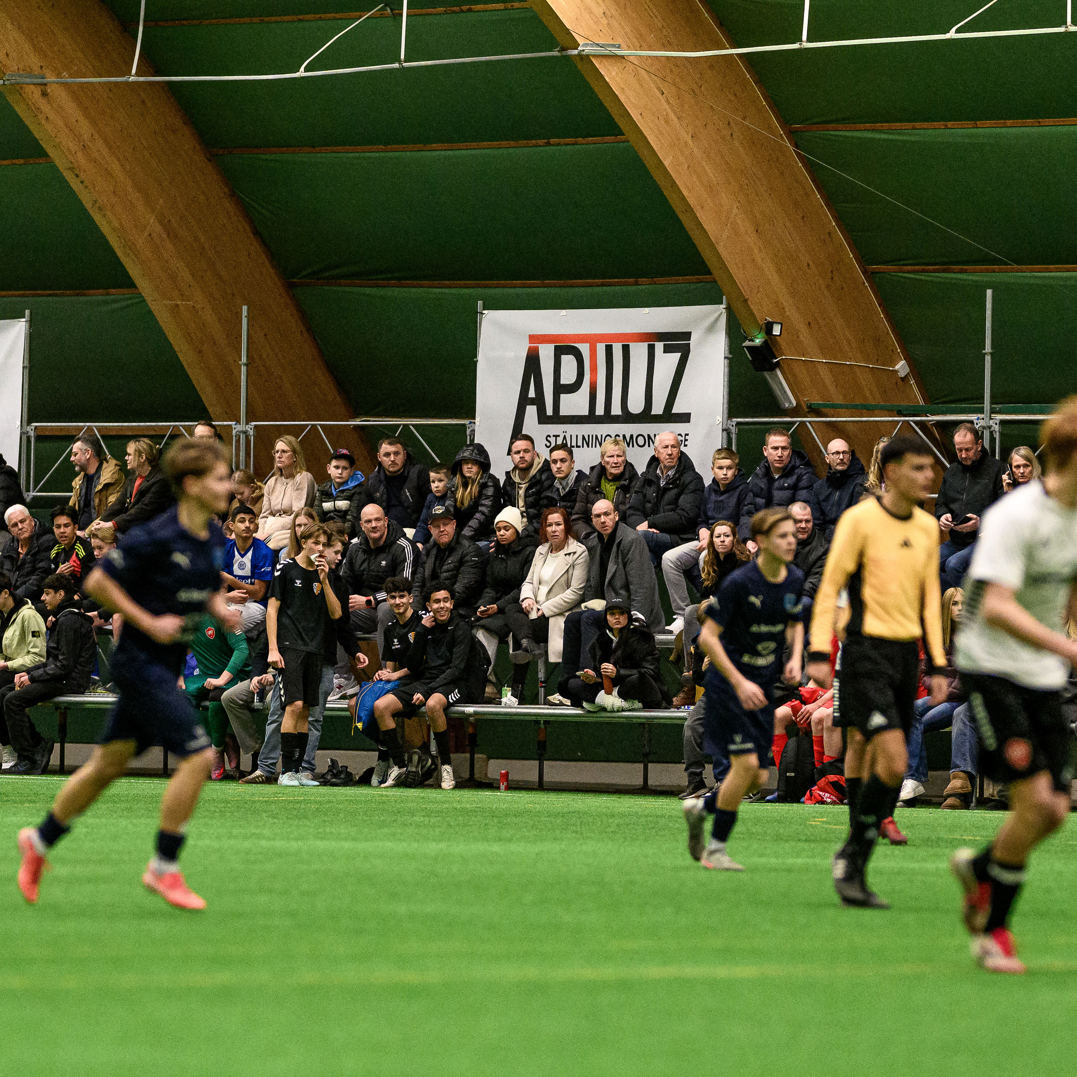 På andra sidan Eric Perssons väg, inne i Baltiska Hallen, spelar yngre barn. I dag är det P10 som gäller. Sam Söllgård Sonesson spelar i FC Bellevue och hans pappa Mark Sonesson tränar en av klubbens lag.