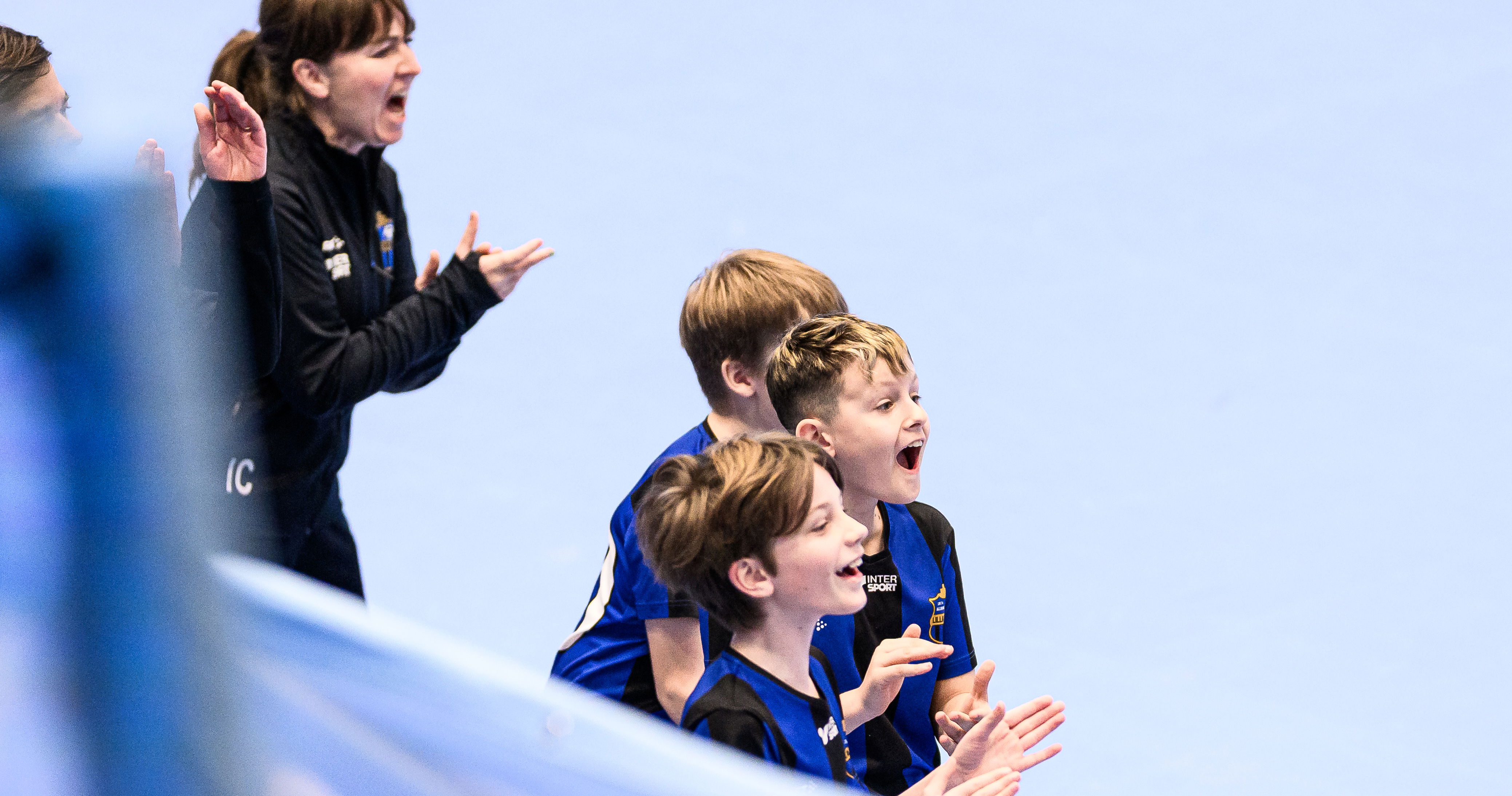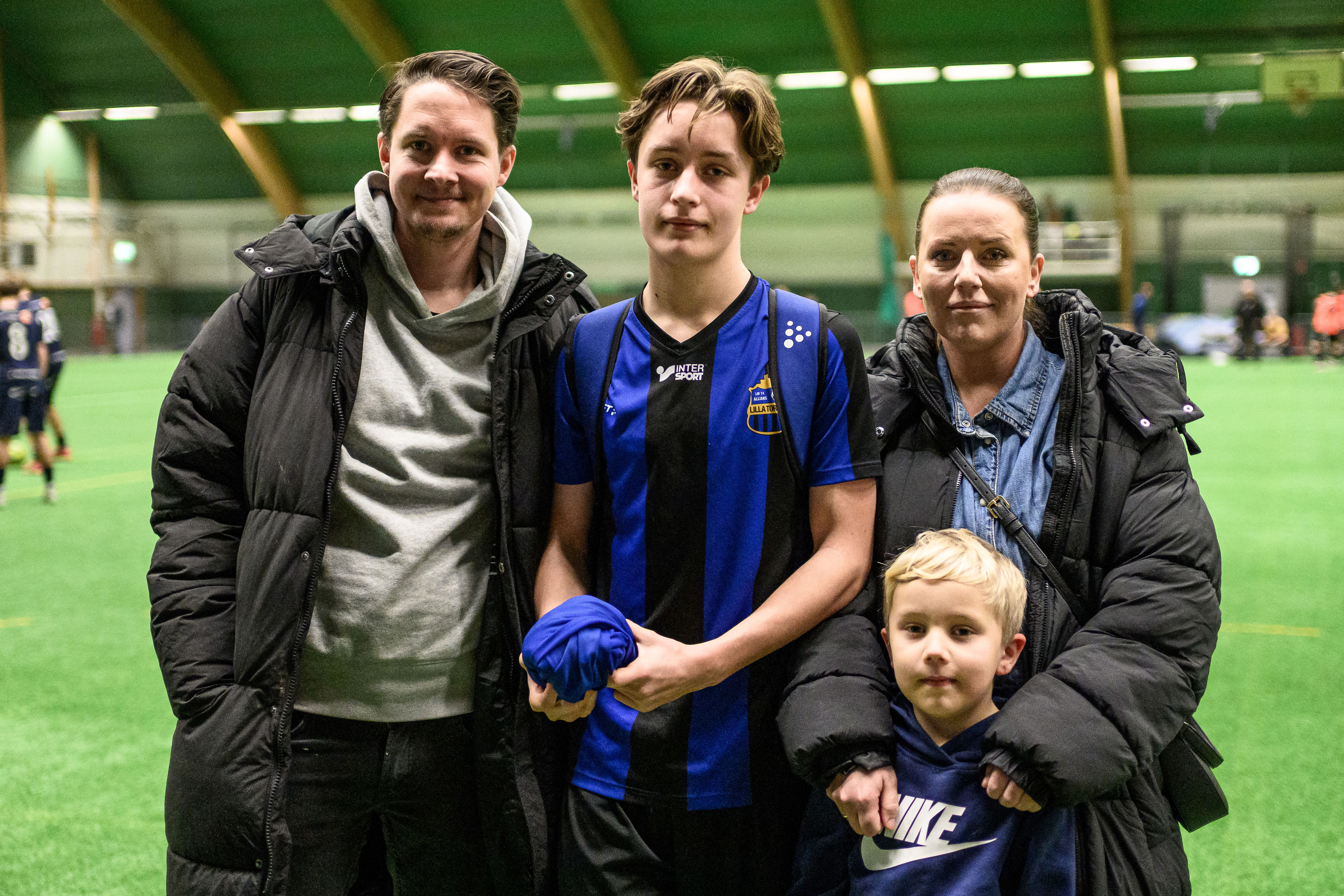 Inne i Kombihallen står Mikaela Englund vid sidan om planen och följer sonen Liam Fredriksson som spelar i Lilla Torg FF. Hon har sällskap av Liams pappa Christopher och lillebror Viggo.