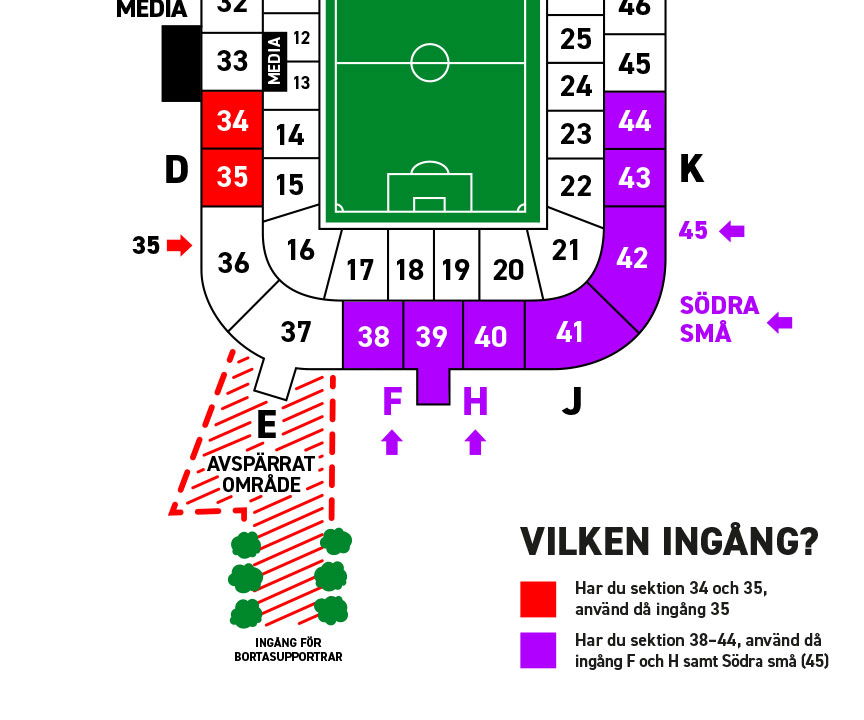 På grund av avspärrningen bakom södra kortsidan ska alla med platser på sektionerna 34 och 35 gå in vid ingång 35. Är du i behov av hiss kan du ta dig till ingång 23 och be en servicevärd om hjälp.